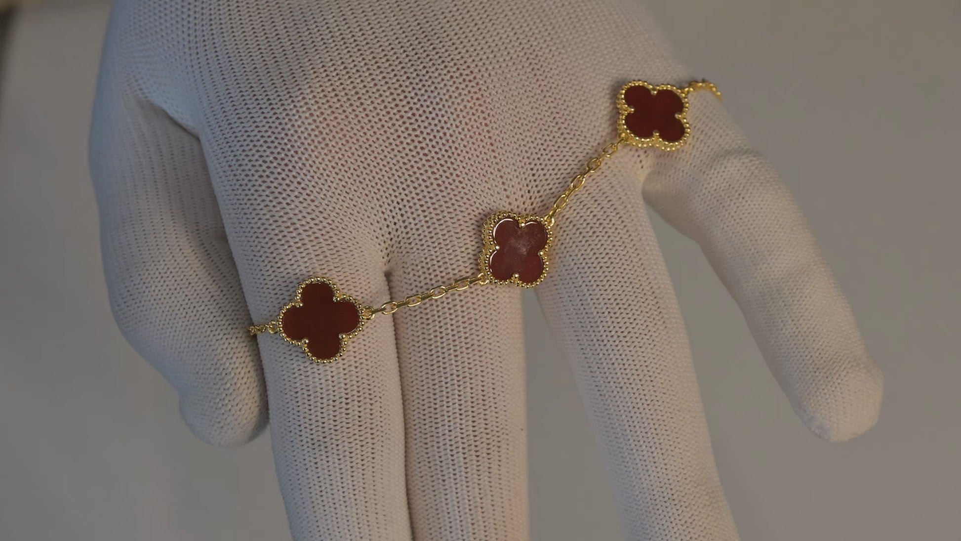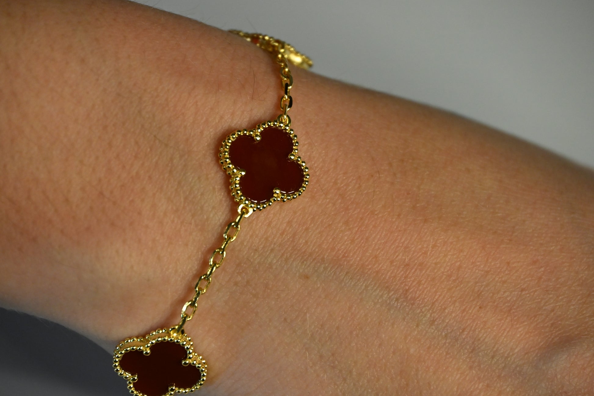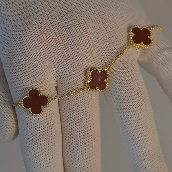 This bracelet features five red carnelian clover motifs, set in your choice of gold-plated, S925 sterling silver or solid 18K gold, offering radiant shine and lasting quality. Whether layered or worn solo, it’s the perfect blend of charm and sophistication.