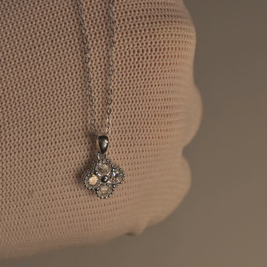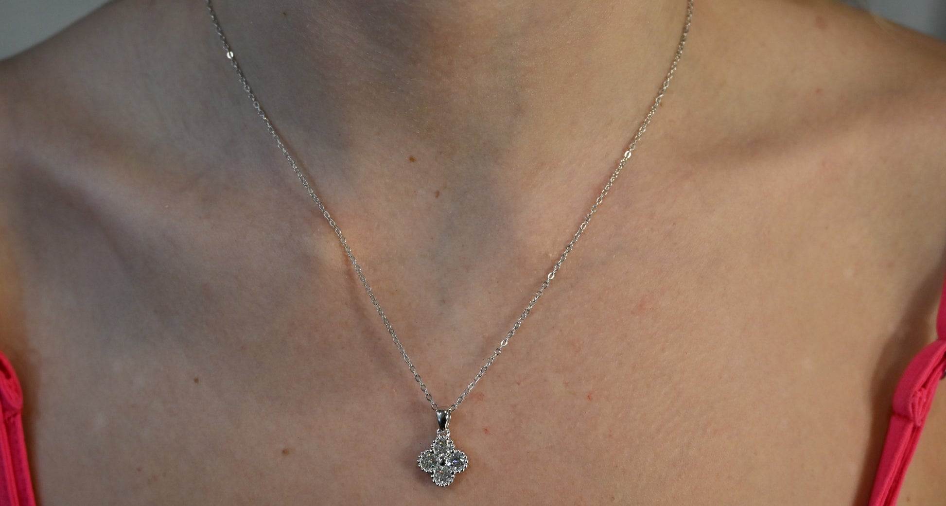 Elevate your elegance with the Seraphina Bloom Pendant, a radiant blend of timeless beauty and modern sparkle. Featuring a total of 1.2 carats of premium moissanite, this clover-inspired cluster pendant shimmers with every movement. The intricate floral arrangement is expertly set in luxurious 18K white gold plating, offering a sophisticated shine that complements any outfit—from everyday chic to special occasions.