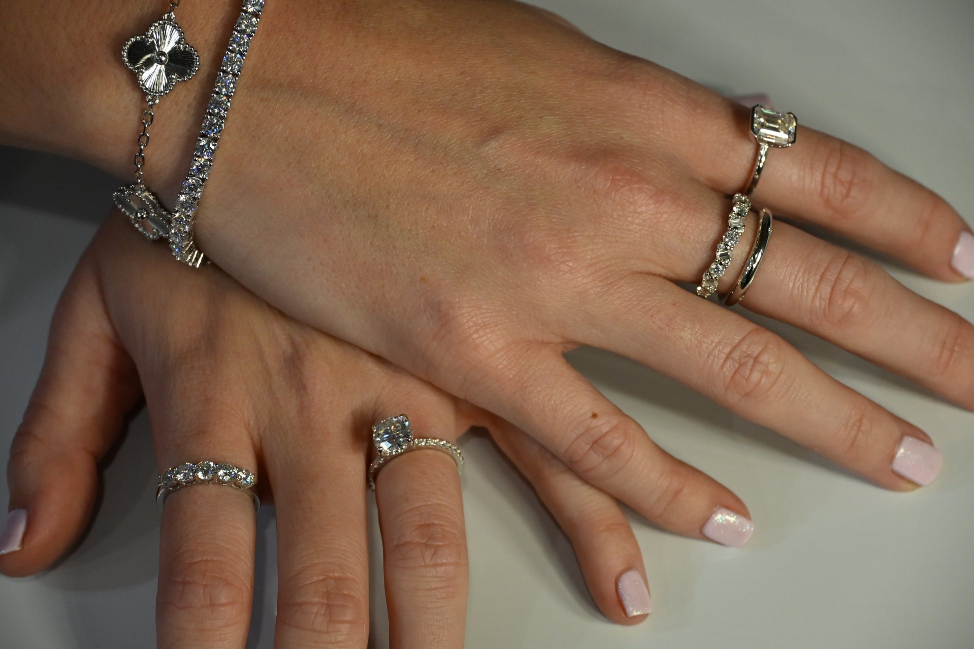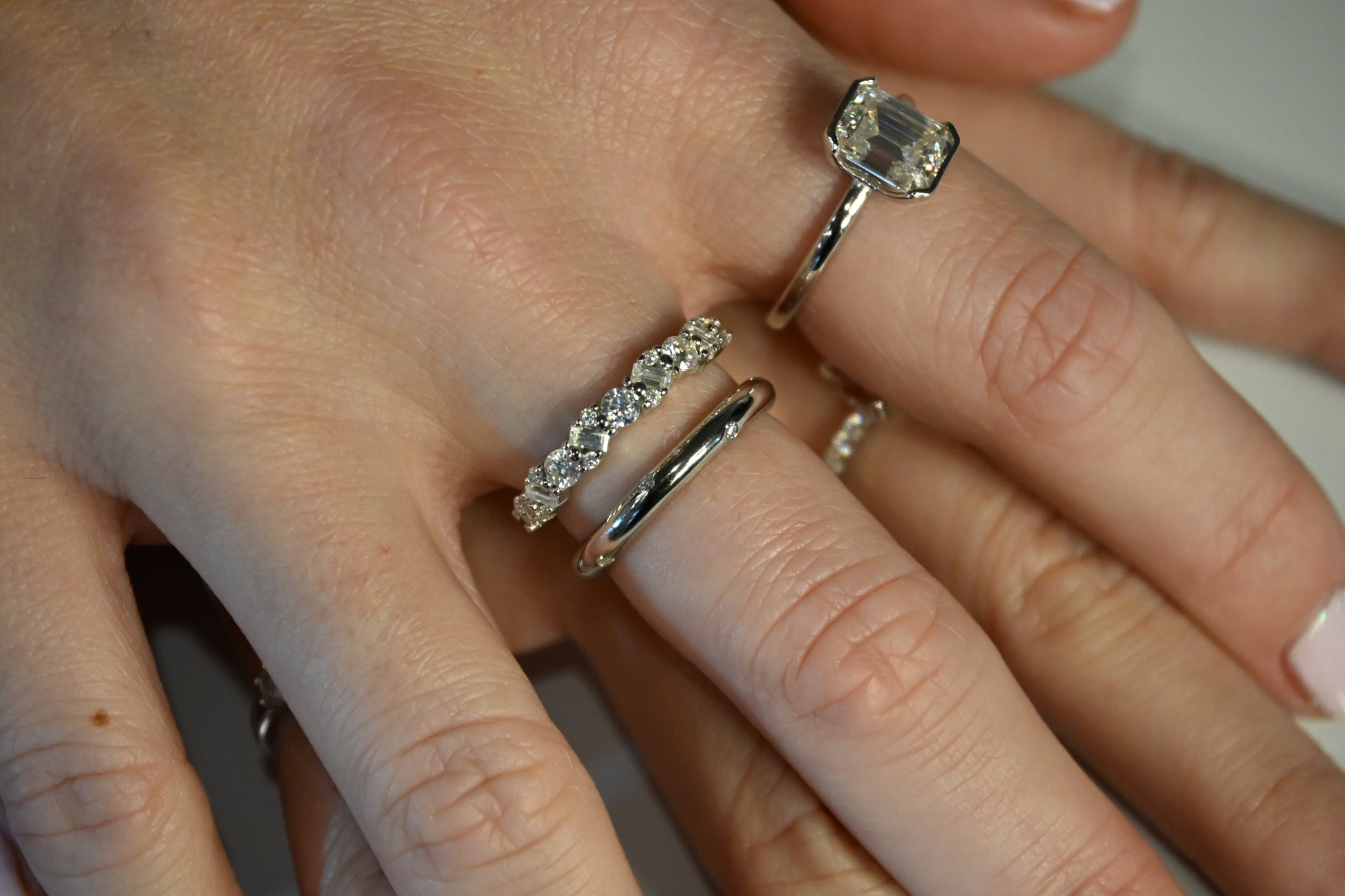 Elegant mix of round and baguette moissanite cuts
